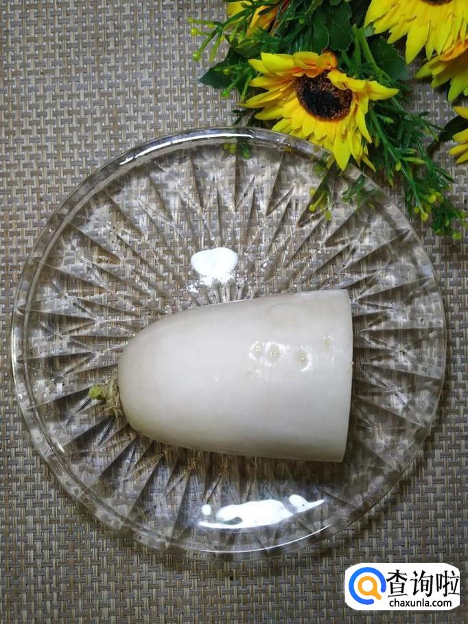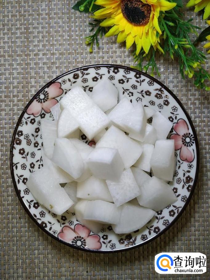 准备适量白萝卜,洗净去皮后,切成块,放入盘中备用。