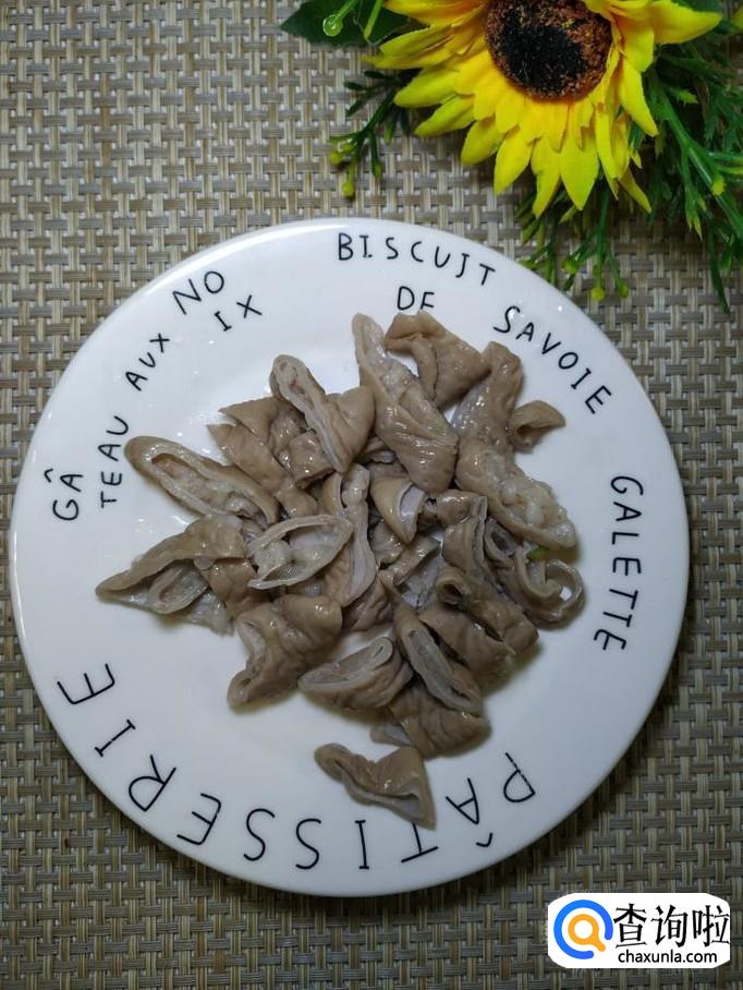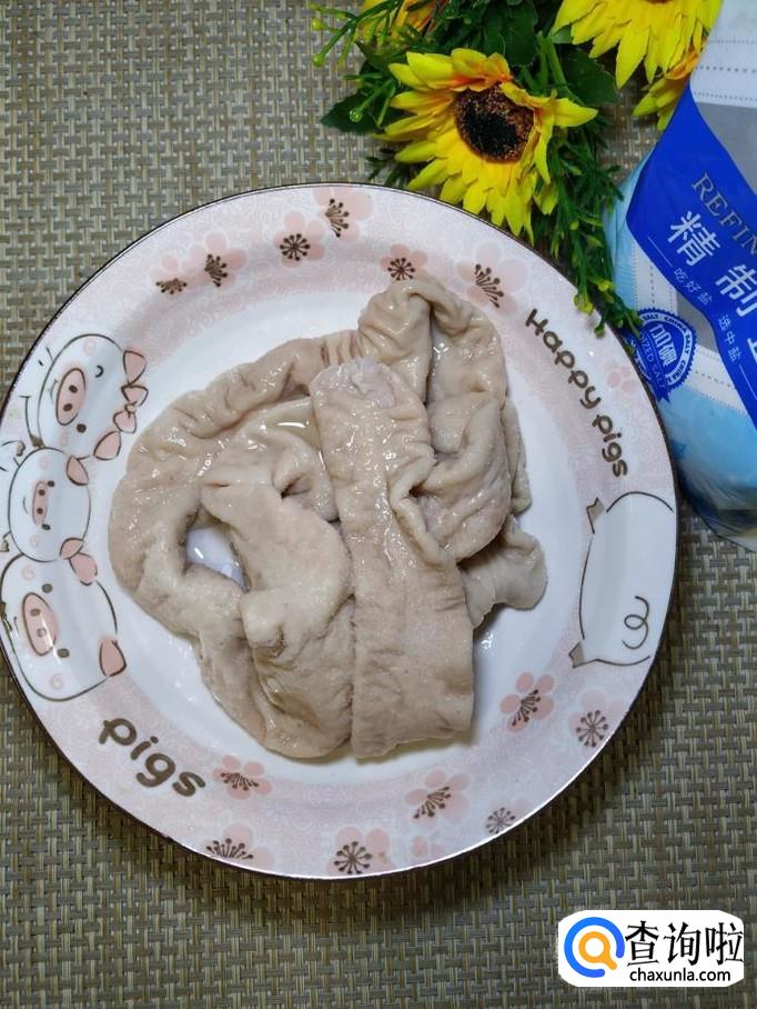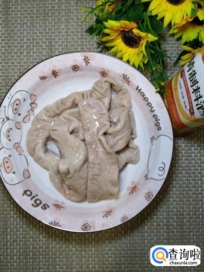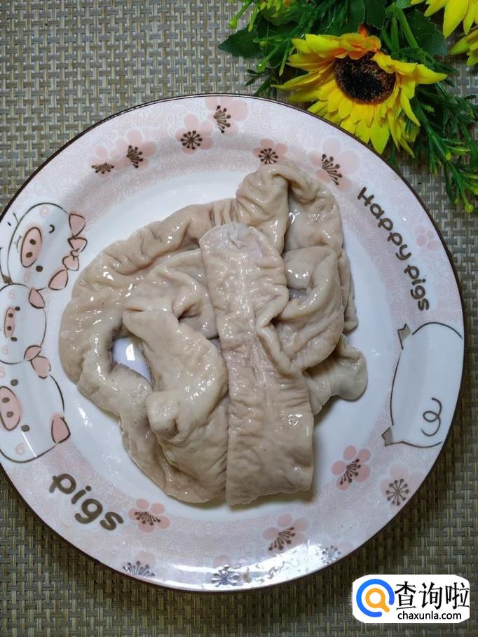 准备适量猪大肠,加入适量料酒和淀粉,泡半个小时,然后再用手使劲搓洗。