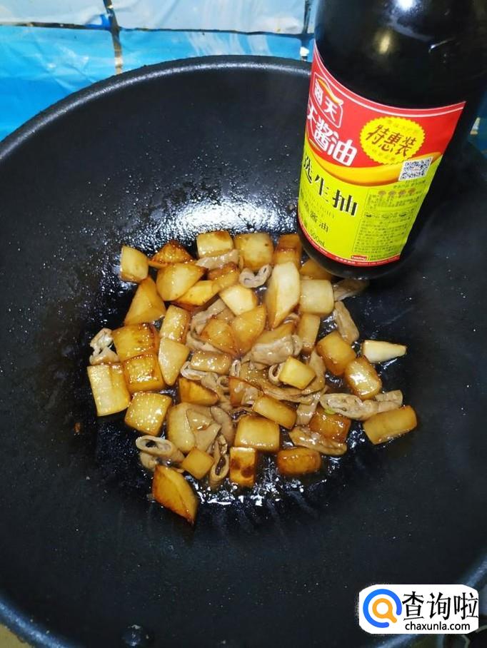 将准备好的猪大肠,倒入锅中,翻炒均匀,加入适量的生抽,增亮色泽。