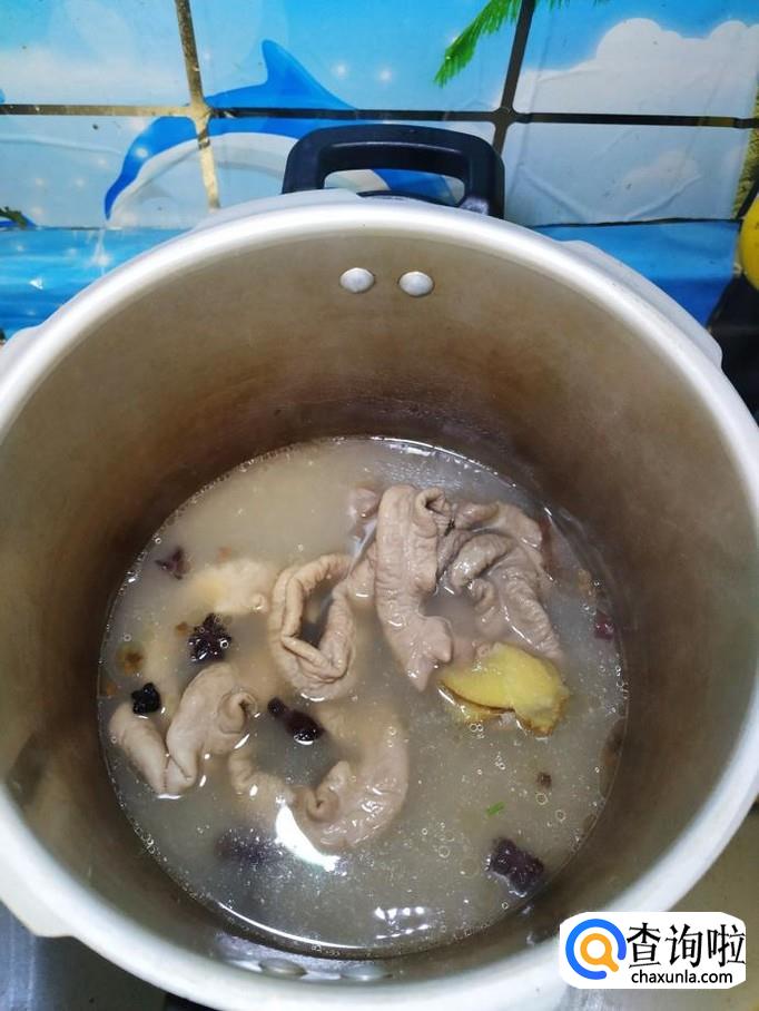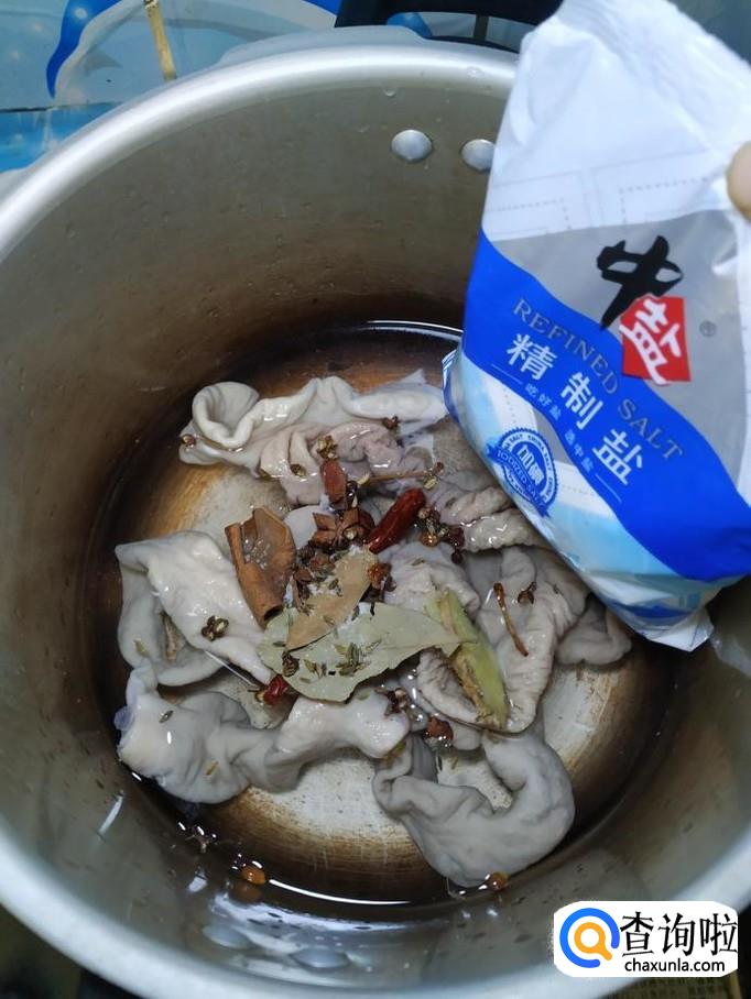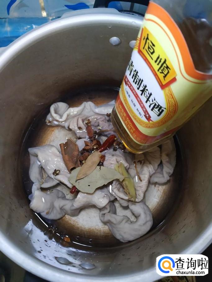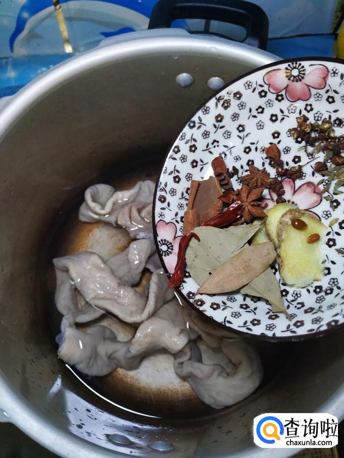 洗净之后,将大肠放入高压锅中,加入适量姜片,干辣椒香叶桂皮,八角,花椒等大料,再加入适量料酒和食盐。