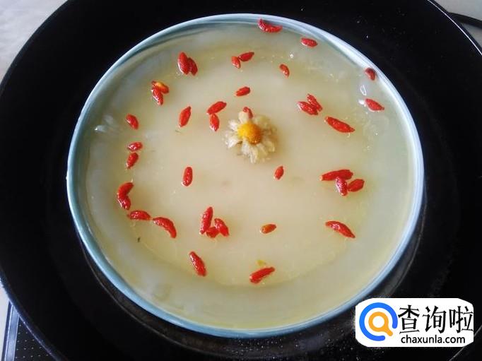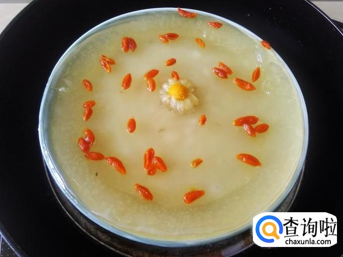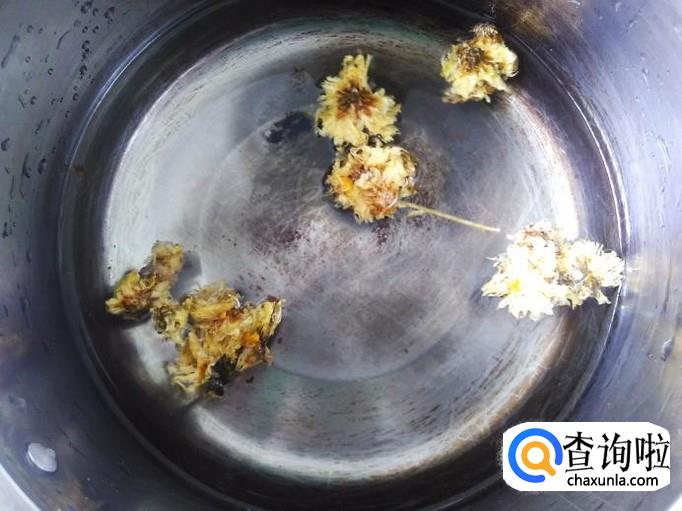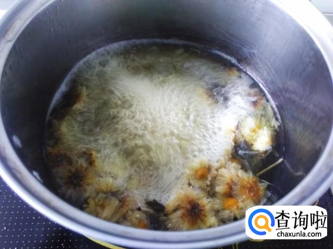 锅里装适量的水,放菊花进去大火煮沸转小火煮8分钟左右,煮到菊花出浓味来。