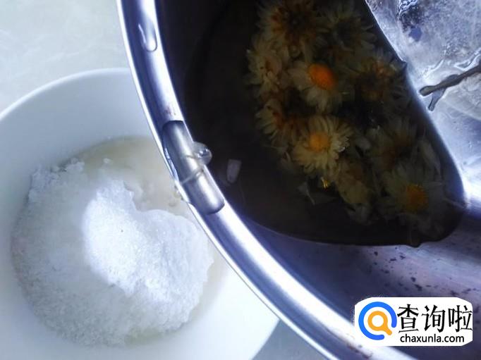 然后把煲好的菊花茶倒进去,再加适量的白糖搅拌。