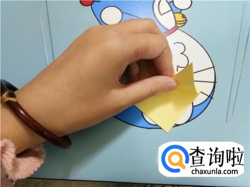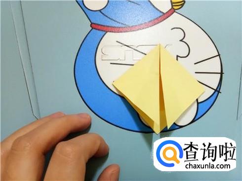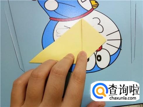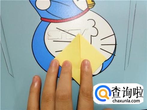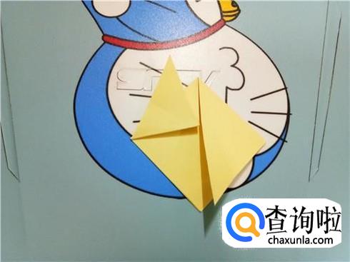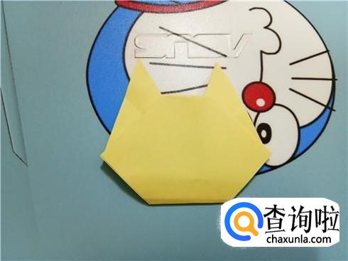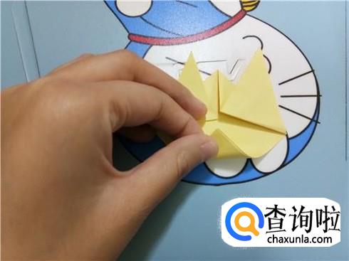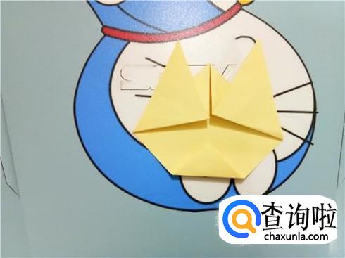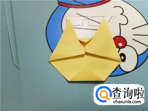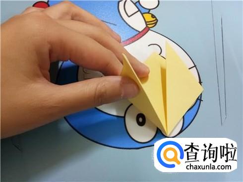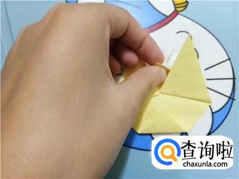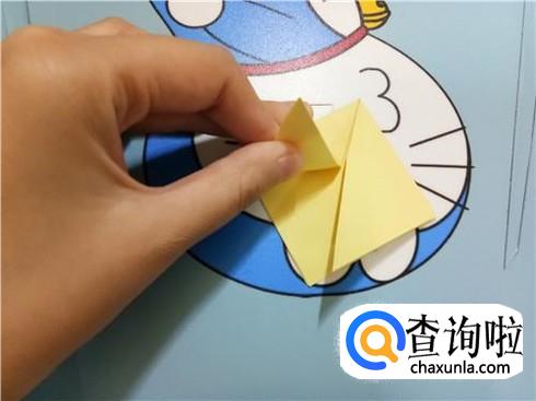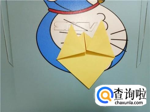我们再将上边两个尖角的中间的凸出部分向下折叠回来,并且翻到另外一面。