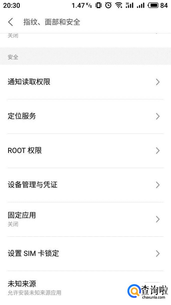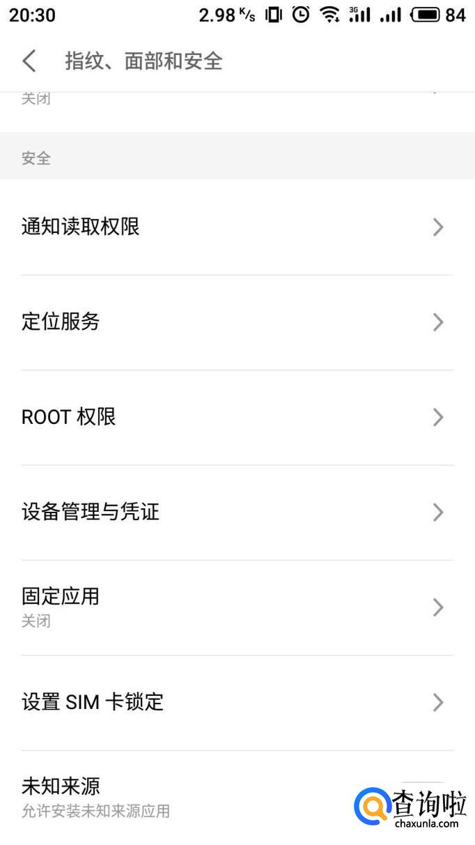 进入指纹、面部和安全设置界面,在安全中我们可以看到“未知来源”选项。