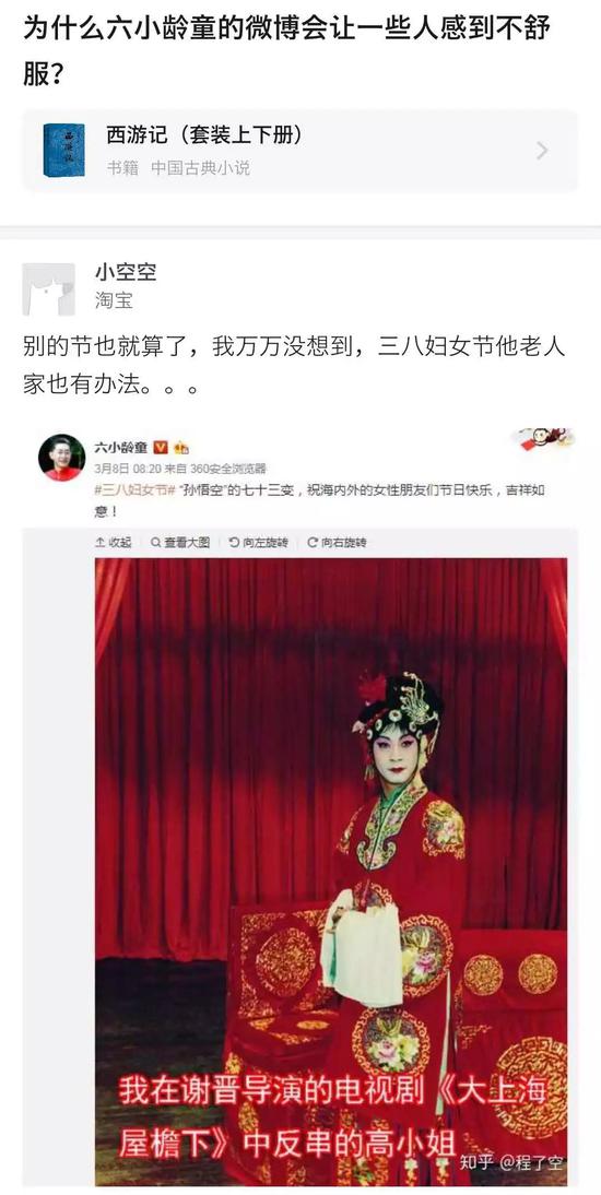有网友在这条问答下写到,“别的节也就算了,万万没想到,三八妇女节他老人家也有办法。”原来,六小龄童连续两年在三八妇女节发微博,附的图片写到“我在谢晋导演的电视剧《大上海屋檐下》中反串高小姐。”有时候,六小龄童热衷虚名,甚至有违人伦而不自知,比如他在沙僧饰演者闫怀礼的忌日,依然借忌日之名宣传电影《敢问路在何方》。