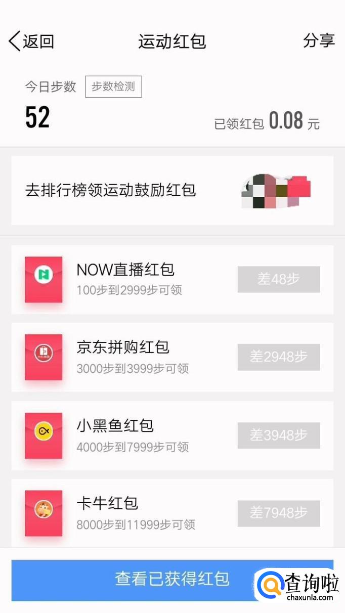 运动红包也就是说当你走够一定步数就可以或得相应步数的红包,点击“去排行榜领运动鼓励红包”也可以领取红包。