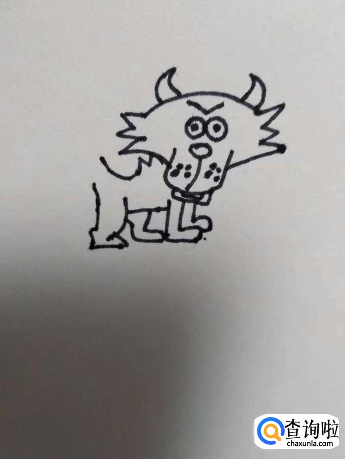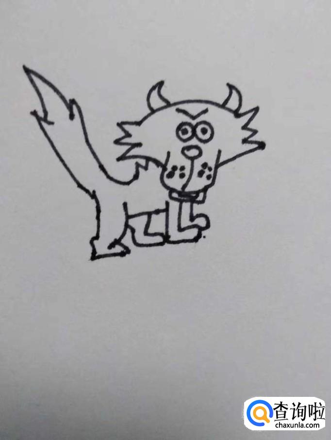 画出狼的尾巴,狼的尾巴整个向上翘起,线条都向上走,靠近末端时最粗,在末端向内拐一下,尾巴两侧向上收,线条弧度要平滑流畅。