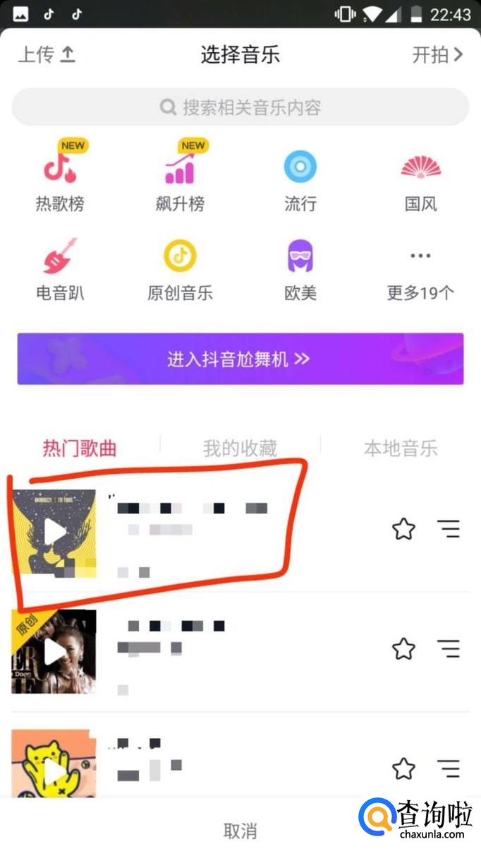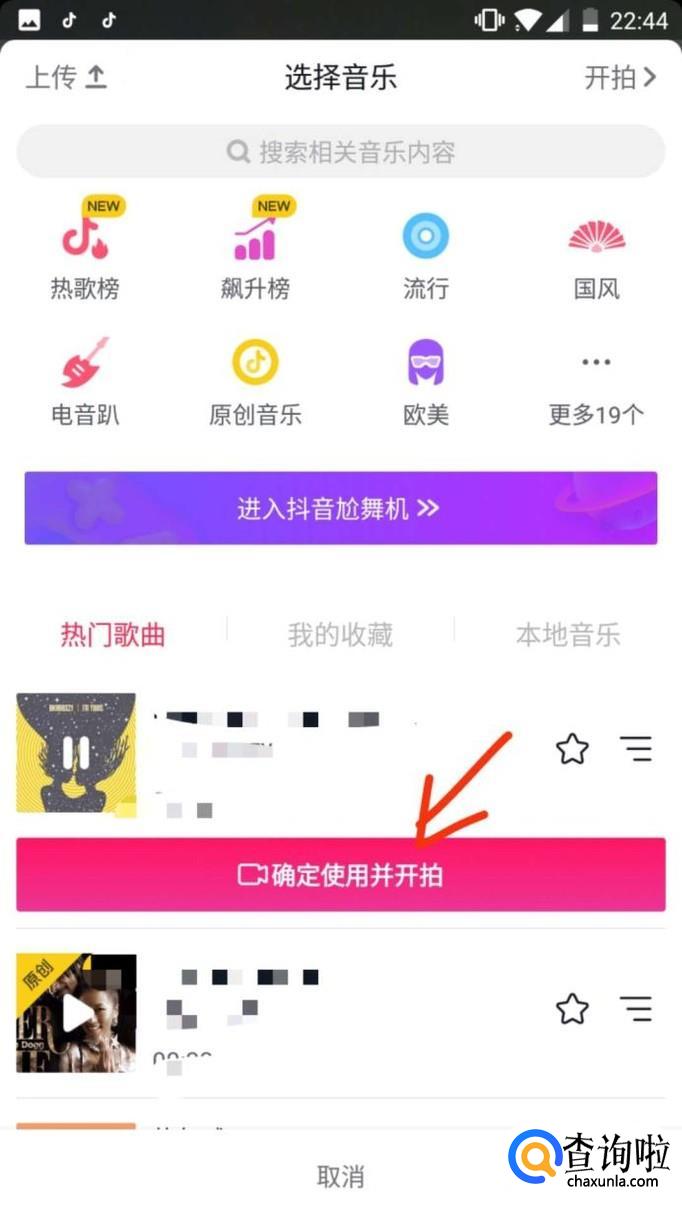 选择好音乐之后,点击该音乐,可以看到下方有“确定使用并开拍”,点击进入开拍界面