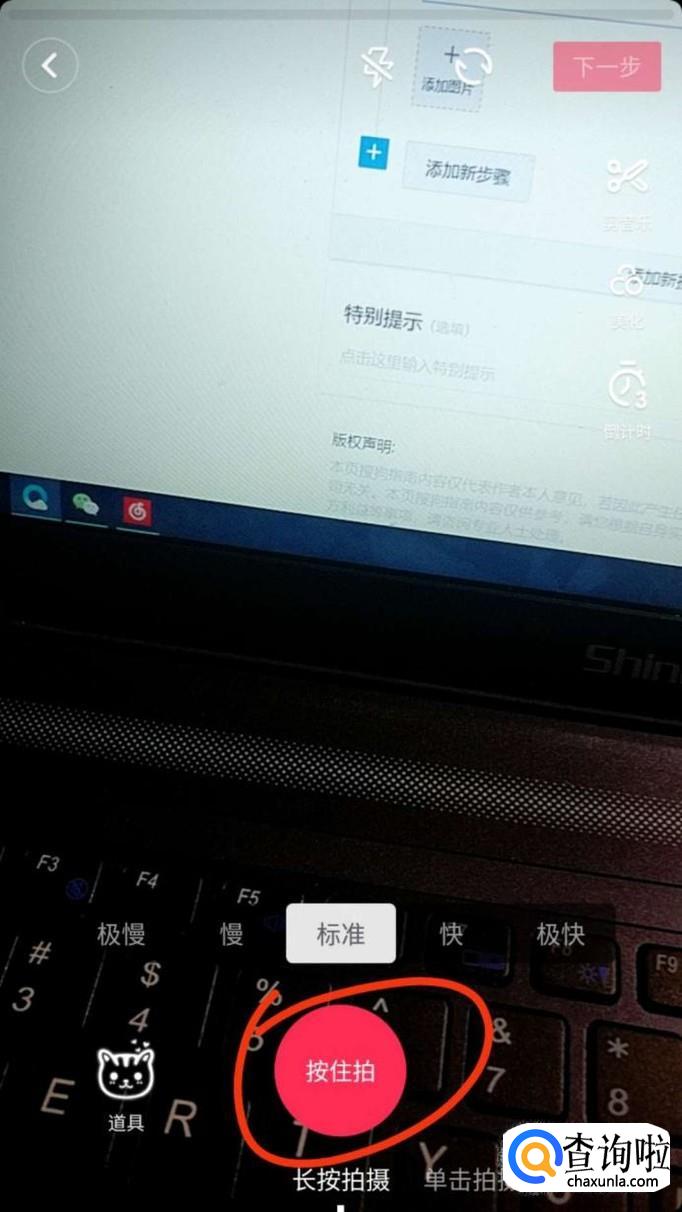 在开拍界面下方,有各种选项,选择好之后,点击下方的按住拍,按住拍就是要一直手按着才能开始拍