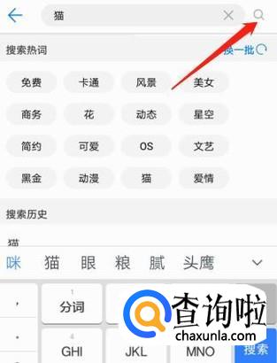 点击“搜索主题”框,在搜索框中输入你想要的动物名称,比如:猫,然后点击放大镜。