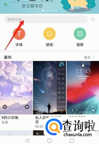 打开手机,点击手机桌面的“主题”,点击“搜索主题”框。