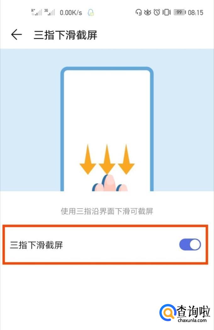 进入三指下滑截屏功能界面,点击开关按钮,开启成功之后,就可以使用该功能了。