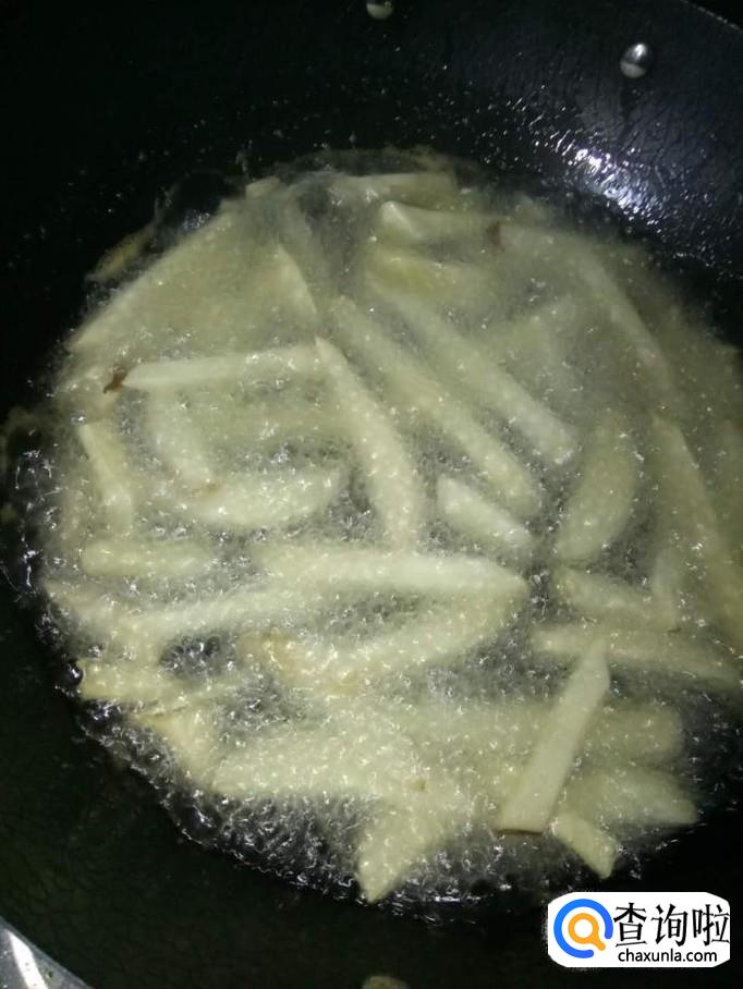 将杏鲍菇洗净,控干水分,切成细条状;放入油锅里炸至变软后,捞出备用;