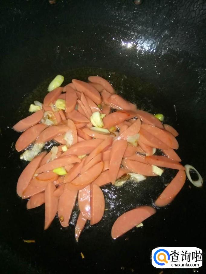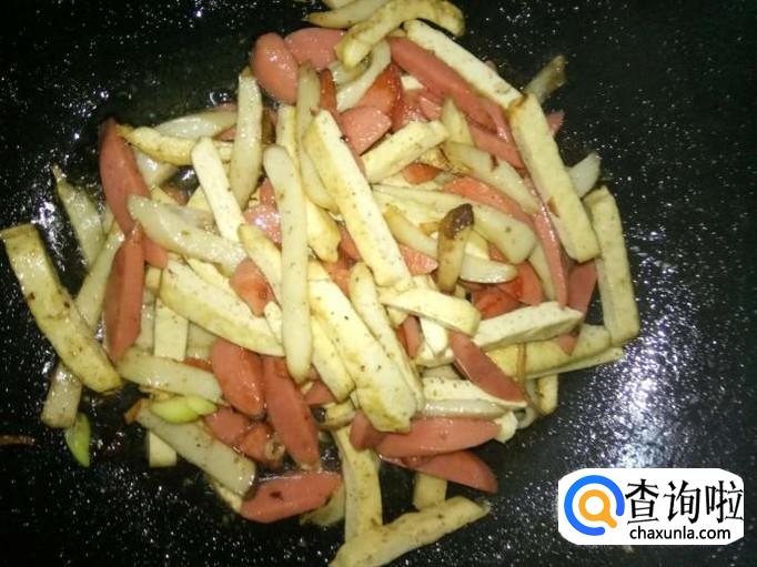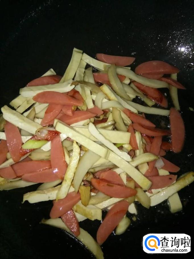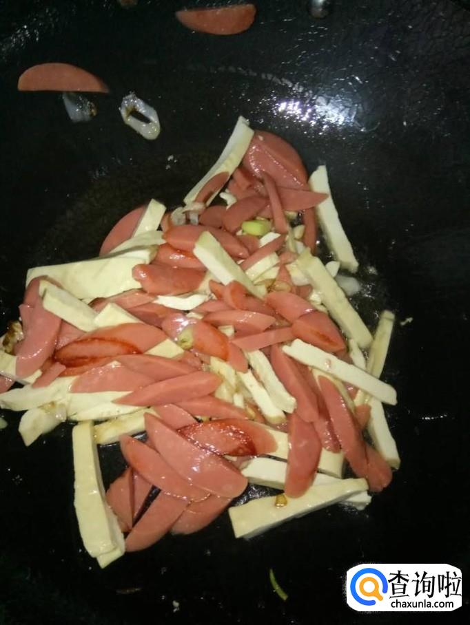 将火腿肠拆开包装,切成细条片状;放入锅里一起翻炒;