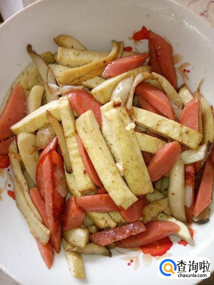 材料:香干 火腿肠 杏鲍菇 大葱 蒜头 盐 鸡精 食用油 蚝油