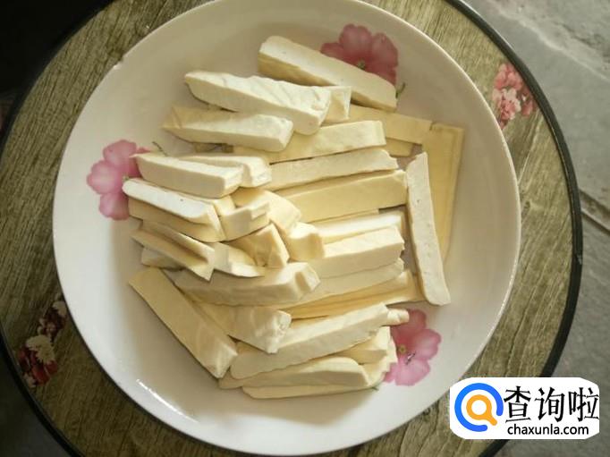 将香干洗一下,切成小条状;取一小段大葱,将大葱外膜去掉,洗一下,切成小段;取3-4个蒜头,去外膜,洗净,切碎;