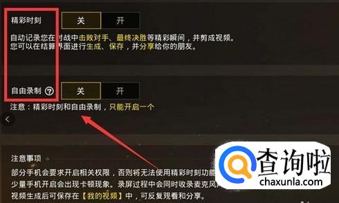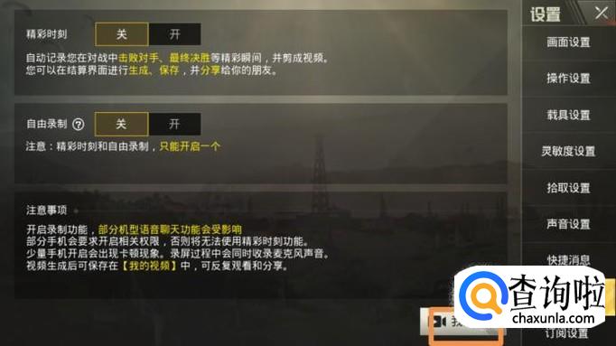 进入设置界面后点击右边下方的“录像设置”就可以开启精彩时刻和自由录制,对游戏过程进行录制了。