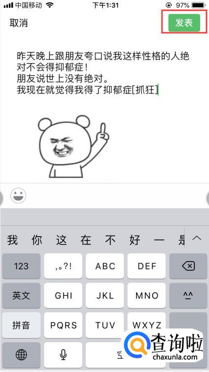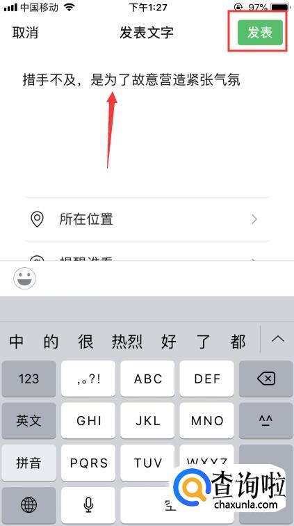 这时界面自动转到发朋友圈界面。接下来,在上方点击一下,选择粘贴,把刚才的文字粘贴过来,点击【发送】即可。