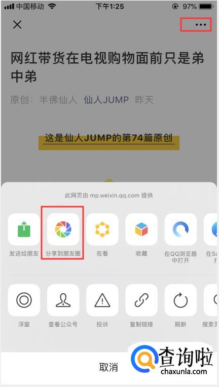 进入这篇文章后,点击文章右上角的【···】,在下方选项中,选择【分享到朋友圈】。