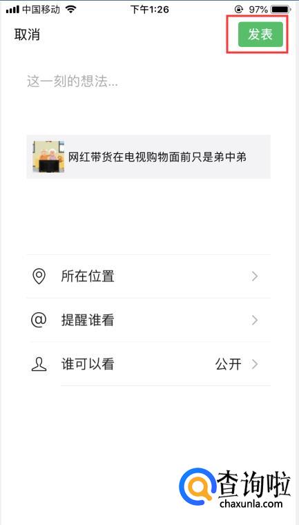 这时,页面变到了自己发朋友圈的界面。直接点击【发送】或添加【这一刻的想法...】也行,这篇文章就转发到自己的朋友圈了。