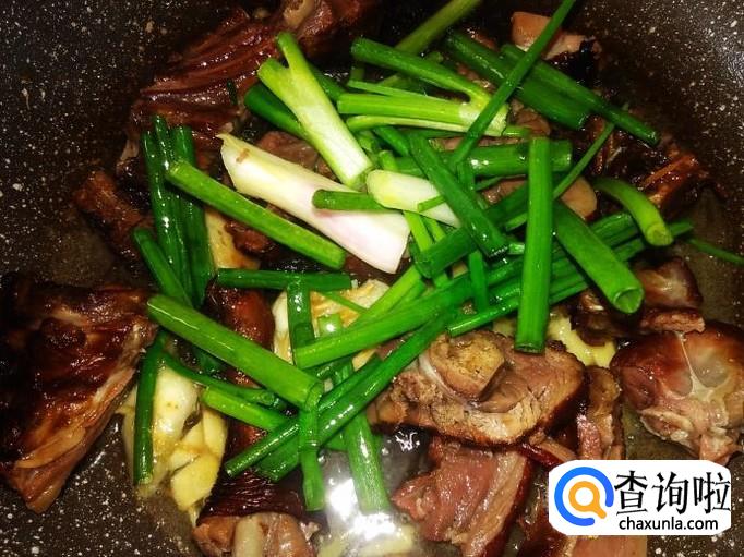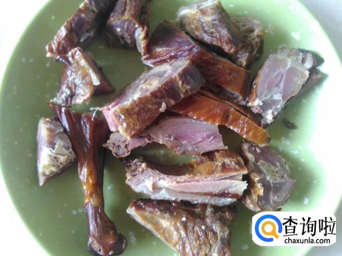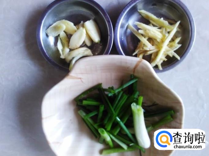 然后把熏鸭清洗干净,斩成一块块,香葱、蒜米、姜丝准备好。