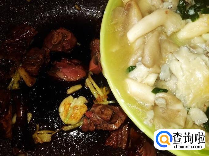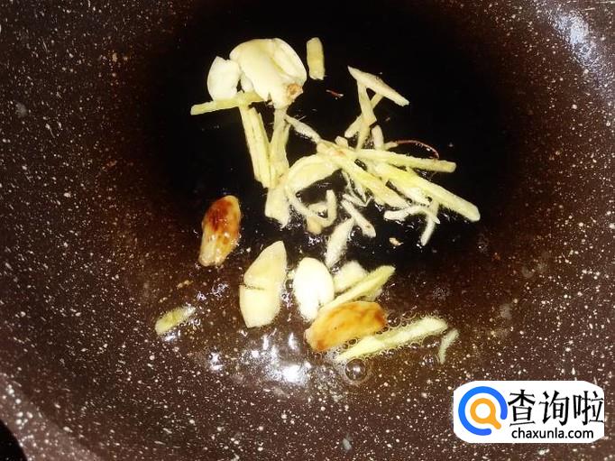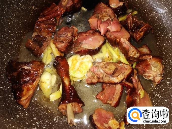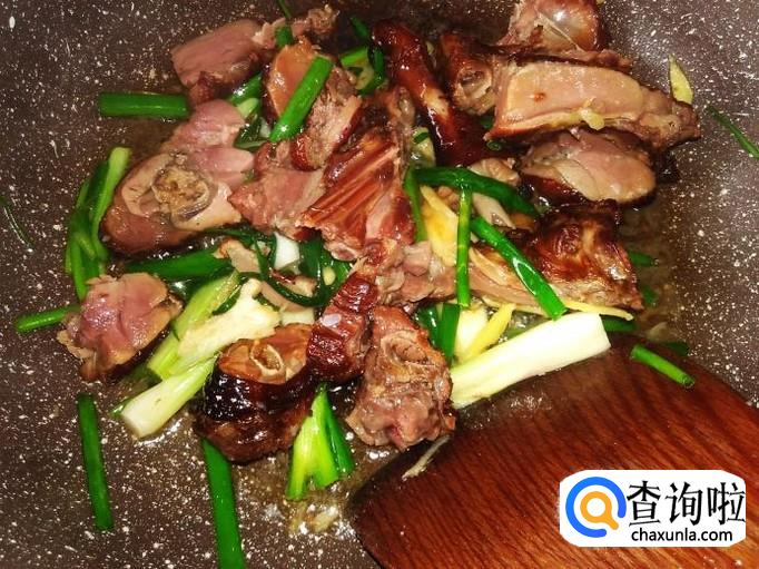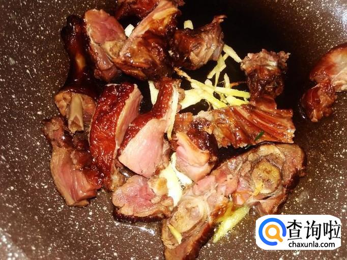 再开火下油,放蒜米、姜丝进去爆香,然后熏鸭下锅翻炒一下。