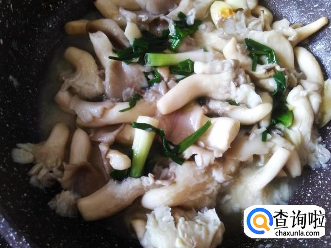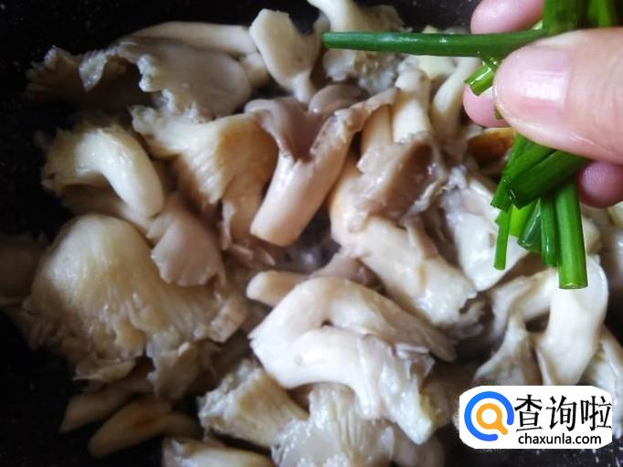 打开盖子下香葱进去翻炒均匀铲铺到平菇面上就可以了。