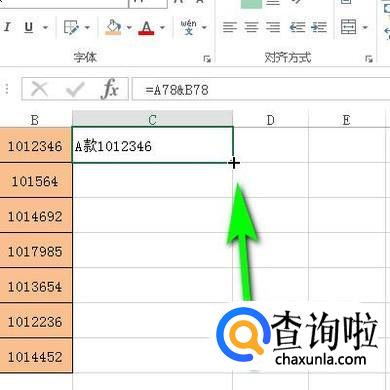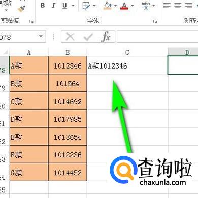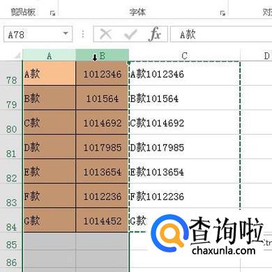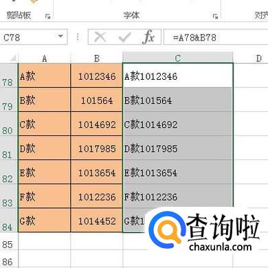 鼠标在C78单元格点一下,选中它,并输入公式:=A78&B78;再按下回车键,得到结果。