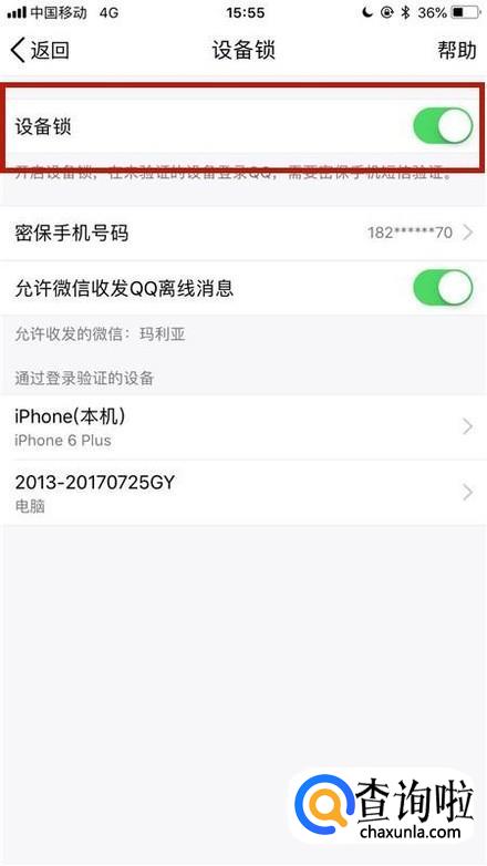 最后点击开启设备锁开关,如下图所示。这样设置完成,我们下次要在陌生设备上登陆我们的QQ就需要手机验证了。