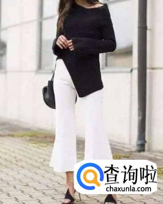 白色喇叭裤搭配黑色不对称上衣,这身搭配颜色反差大,加上上衣不对称的下摆,能突显人的个性,而且显得特别时尚。