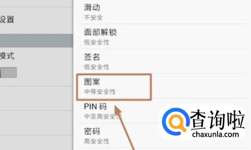 然后我们即可在选择屏幕锁界面的右侧看到“图案”这一项了,如下图;