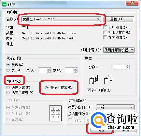 在面板中,我们先选择打印机(选择本机连接的打印机),然后把打印内容设置为“整个工作簿”,点击确定。