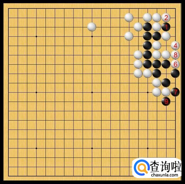 白棋立刻在白8处粘上,不给黑棋任何打劫的机会。毕竟白棋的底边这块面积很大,不能给黑棋任何可趁之机。如图所示。