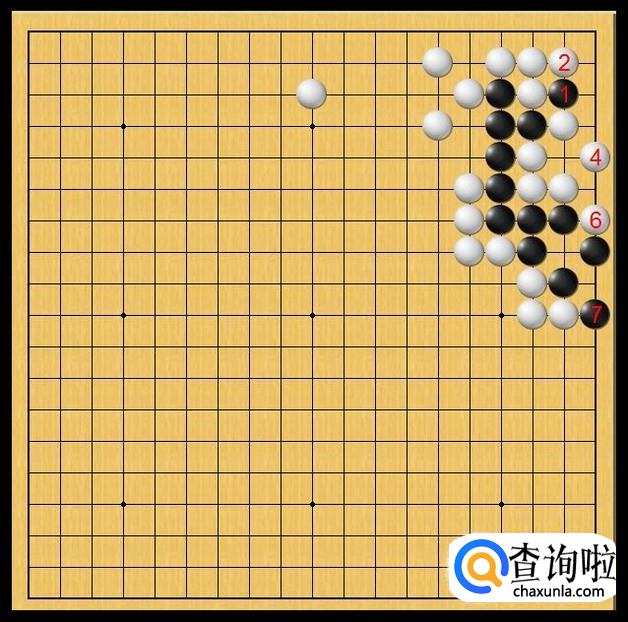 黑棋现在寻找劫材,力争夺回黑5这个点。黑棋在此处寻找了很久,也没发现劫材。于是,黑棋在黑7处落子,黑棋想通过这个劫材跳出白棋的包围圈。如图所示。