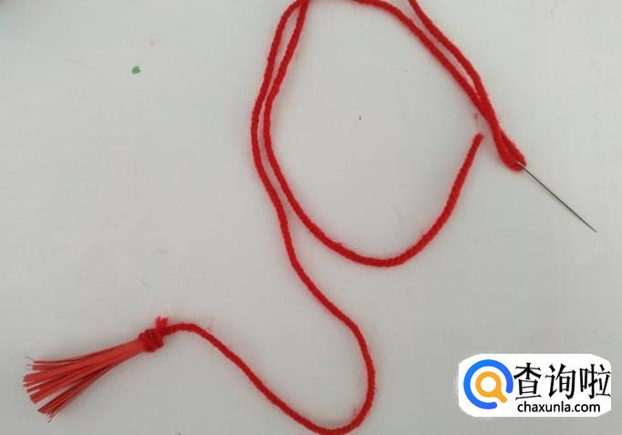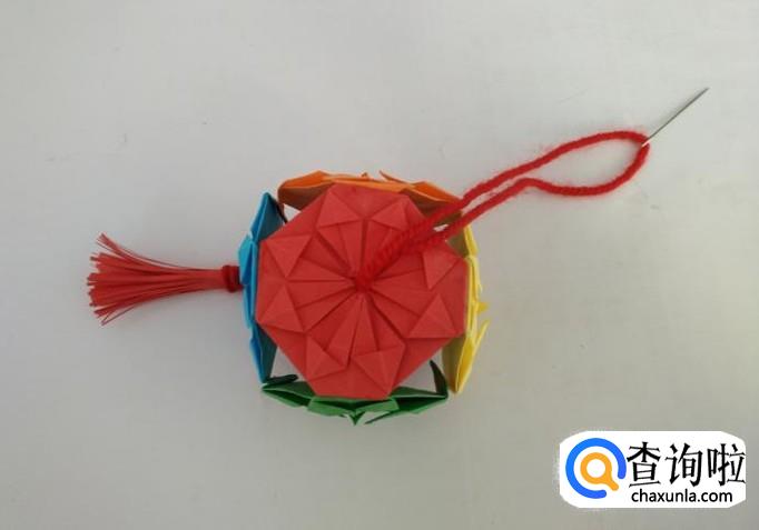 把红线从灯笼的底部穿上来。