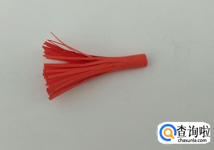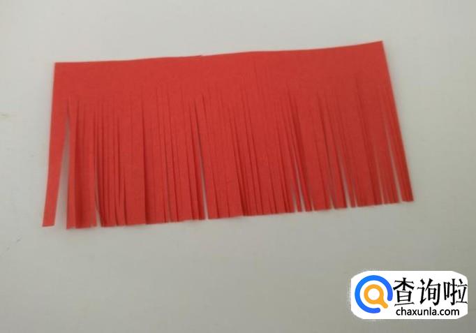 把红色长方形纸用剪刀剪出竖条后卷起来,这样穗头就做好了。(注意上方不要剪断)