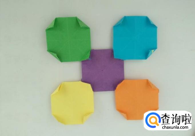 将其中一个正方形的四角涂上胶水,然后把另外4个正方形的角粘到一起。