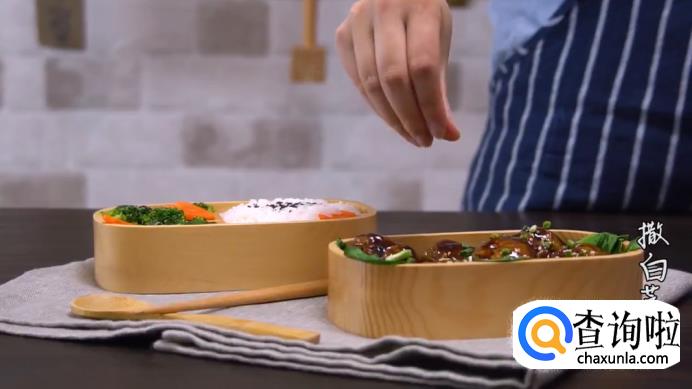 将蒜蓉西蓝花也装进便当盒,再给面筋塞肉上撒上一点白芝麻,这一个便当组合就完成了。