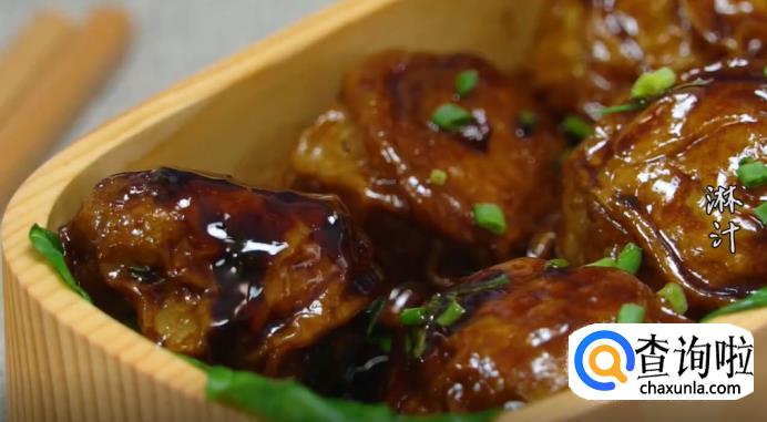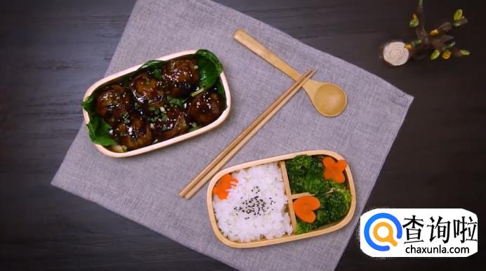 时间到之后,打开锅盖,撒上葱花,转小火收汁,然后将面筋放入便当盒里,最后淋一点汁,这道面筋塞肉就完成了。