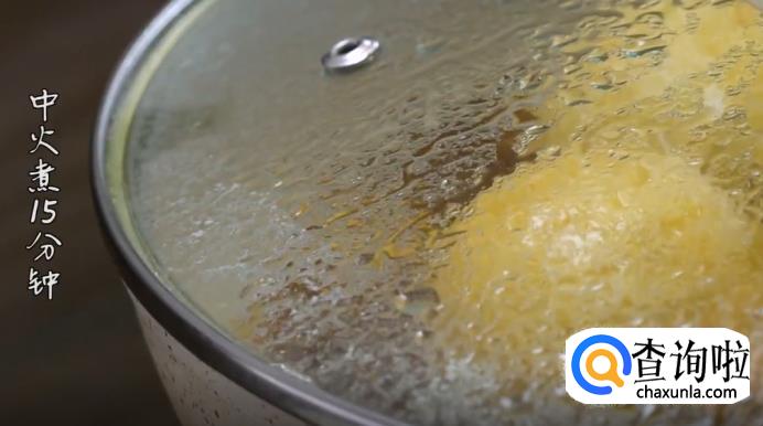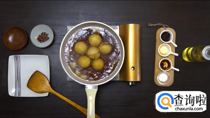 热锅凉油,放入姜片和花椒煸香,再把面筋开口朝下放入锅中,加入适量清水和冰糖,然后加八角、香叶、盐、蚝油、生抽、老抽,盖上锅盖大火烧开,再中火煮15分钟。