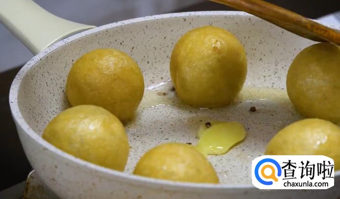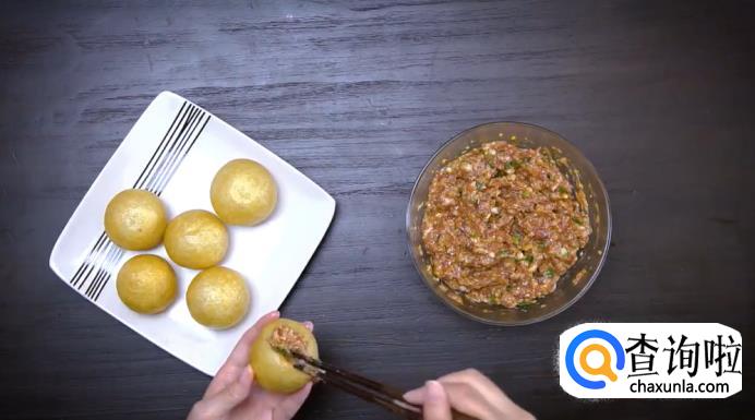 在准备好的面筋上用筷子戳一个洞,搅动留出空隙,然后把拌好的肉馅塞进去,将面筋填满。