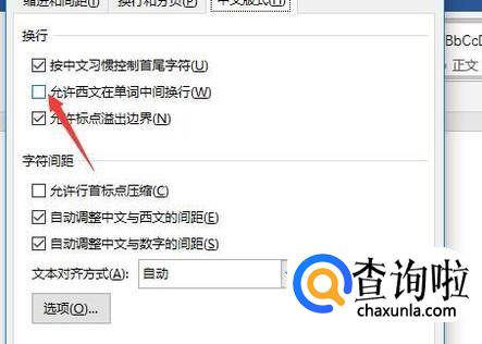 接着在换行的一栏中点击允许西文在单词中间换行,直接将这个按钮勾选即可。