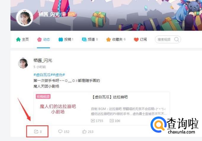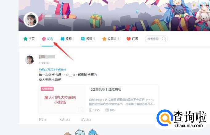 然后选择一个喜欢的人进入它的主页点击图中的动态,如下图。