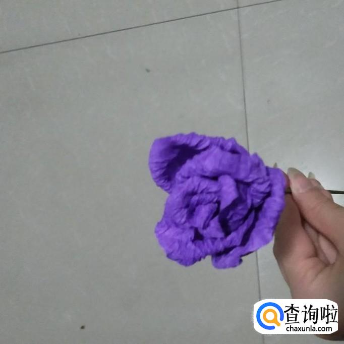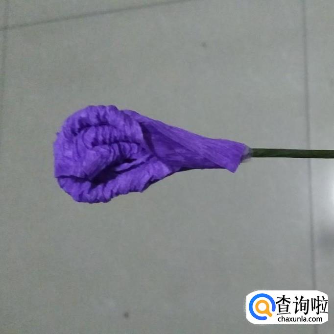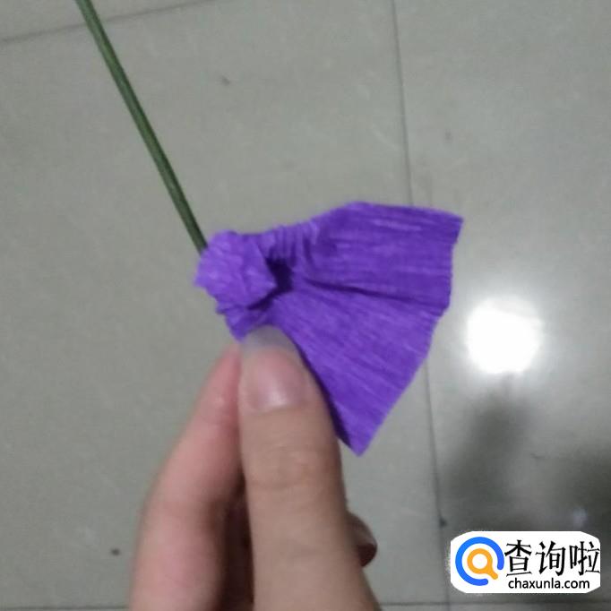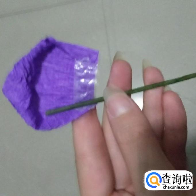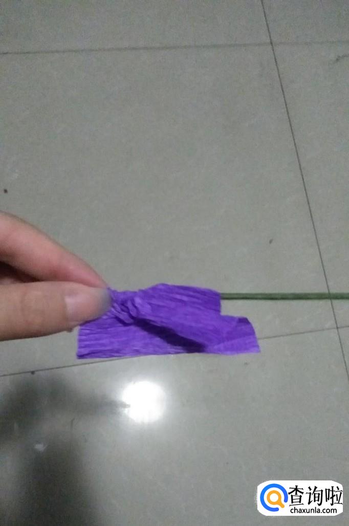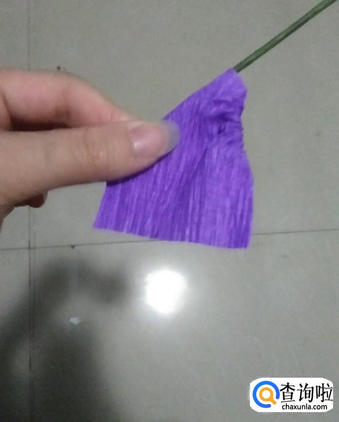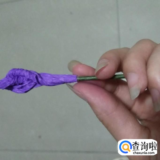 将皱纹纸的一角按照如下图一所示的方式裹在花杆上,然后如下图2所示,用两只手将皱纹纸往中间压,接下来,抽出细铁丝。