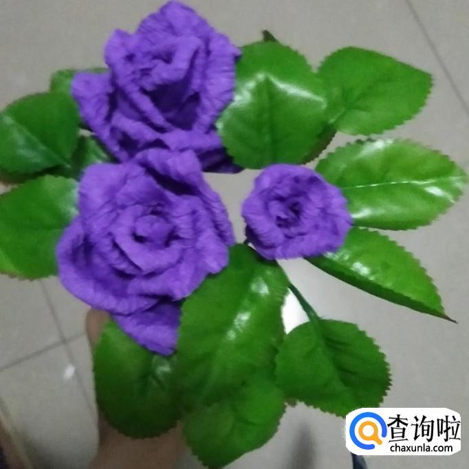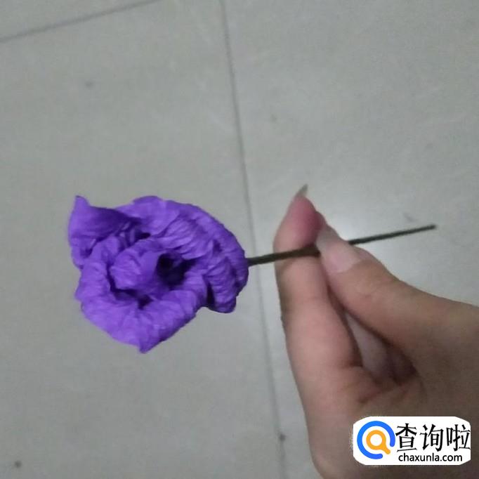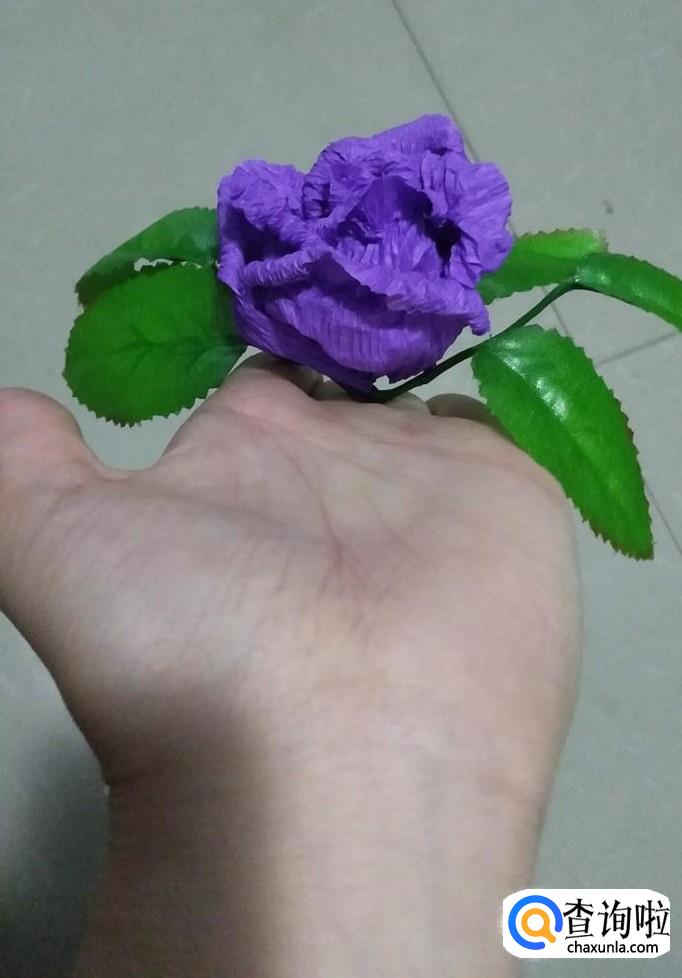 然后,重复刚刚的所有操作,直到八片花瓣都完整的粘在了花杆上,最后,将玫瑰花叶子从花杆的下端插入,做好后如下图3,漂亮的玫瑰花就OK啦