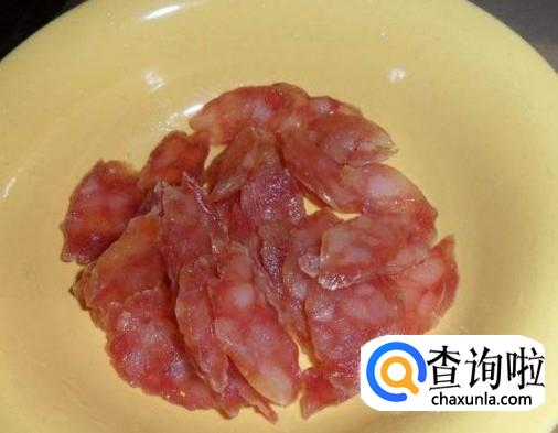 将荷兰豆去掉两头,用清水洗净,将腊肠切成薄片,葱切成片。