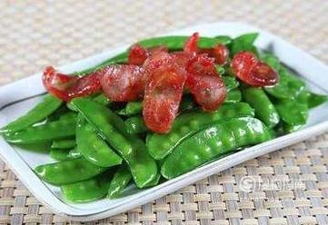 将腊肠倒入锅中,将荷兰豆和腊肠翻炒均匀,荷兰豆炒成绿绿的颜色,就可以装盘了,这道菜,颜色漂亮,味道清香,非常好吃。