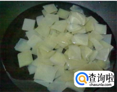 魔芋一小块就足够,切成块,锅里烧开水,把魔芋放进去焯水两分钟,捞出来过凉水然后再放进去一分钟,捞出来浸泡水里两分钟然后控干水分。