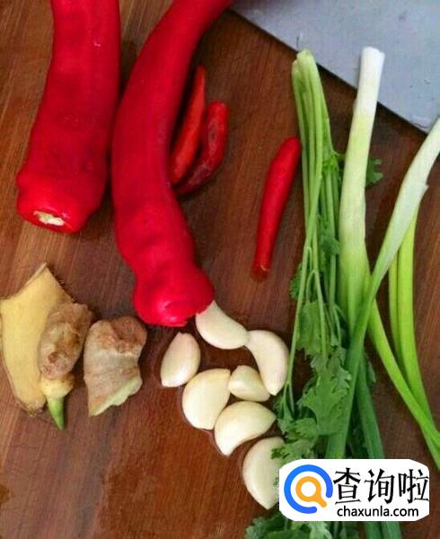 切点生姜片,葱段,以及一些大蒜末,再切点红辣椒和香菜,当然不喜欢吃香菜的就不用放了。