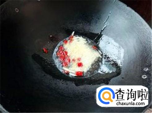 锅里面烧热油,把红辣椒和大蒜末放进去炒出香气,然后把生姜片放进去,再把魔芋放进去小火翻炒。